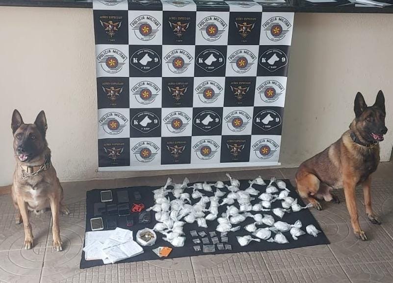Durante a operação, foi empregado o cão policial de detecção de entorpecentes, que indicou uma residência inabitada. Após a entrada, foram localizados: