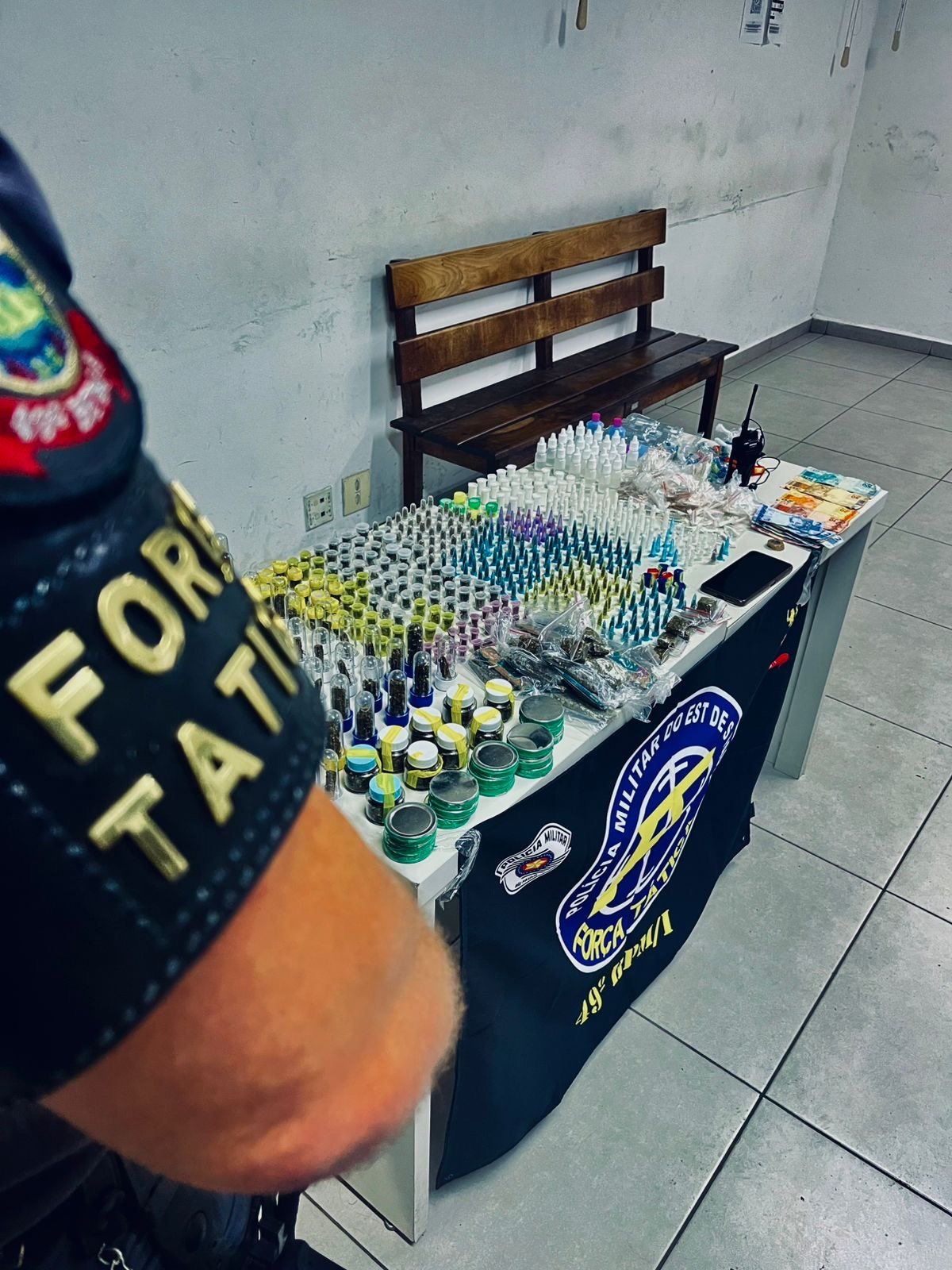 Com ele, os policiais localizaram uma sacola contendo diversas porções de drogas já fracionadas e prontas para venda. Durante a abordagem, houve resistência, sendo necessário o uso de força moderada para a contenção e algemação.