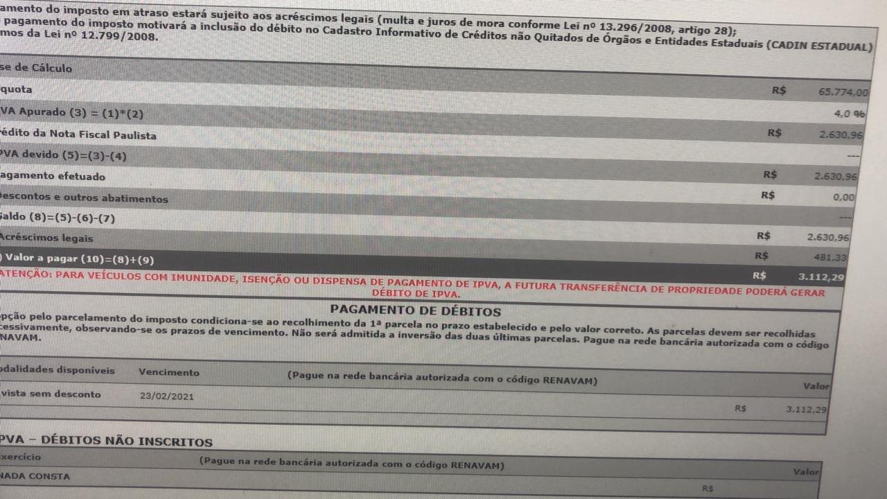 Nesta sexta-feira (09) a nossa seguidora Érica, que é moradora de Várzea Paulista, enviou uma mensagem indignada, ela reclama e com razão da cobrança do IPVA 2021.