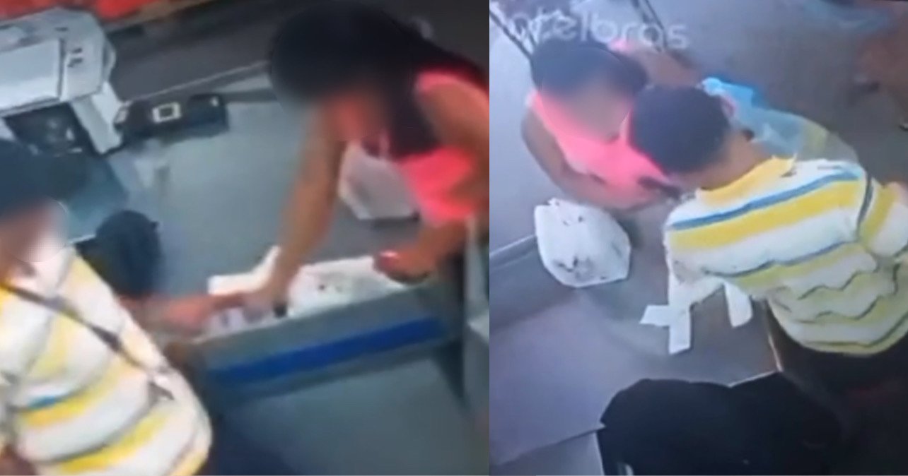 O celular estava carregando próximo aos caixas, quando o indivíduo percebeu. Aproveitando a distração dos funcionários, ele pega o celular e entrega para sua companheira, que esconde em sua bolsa.