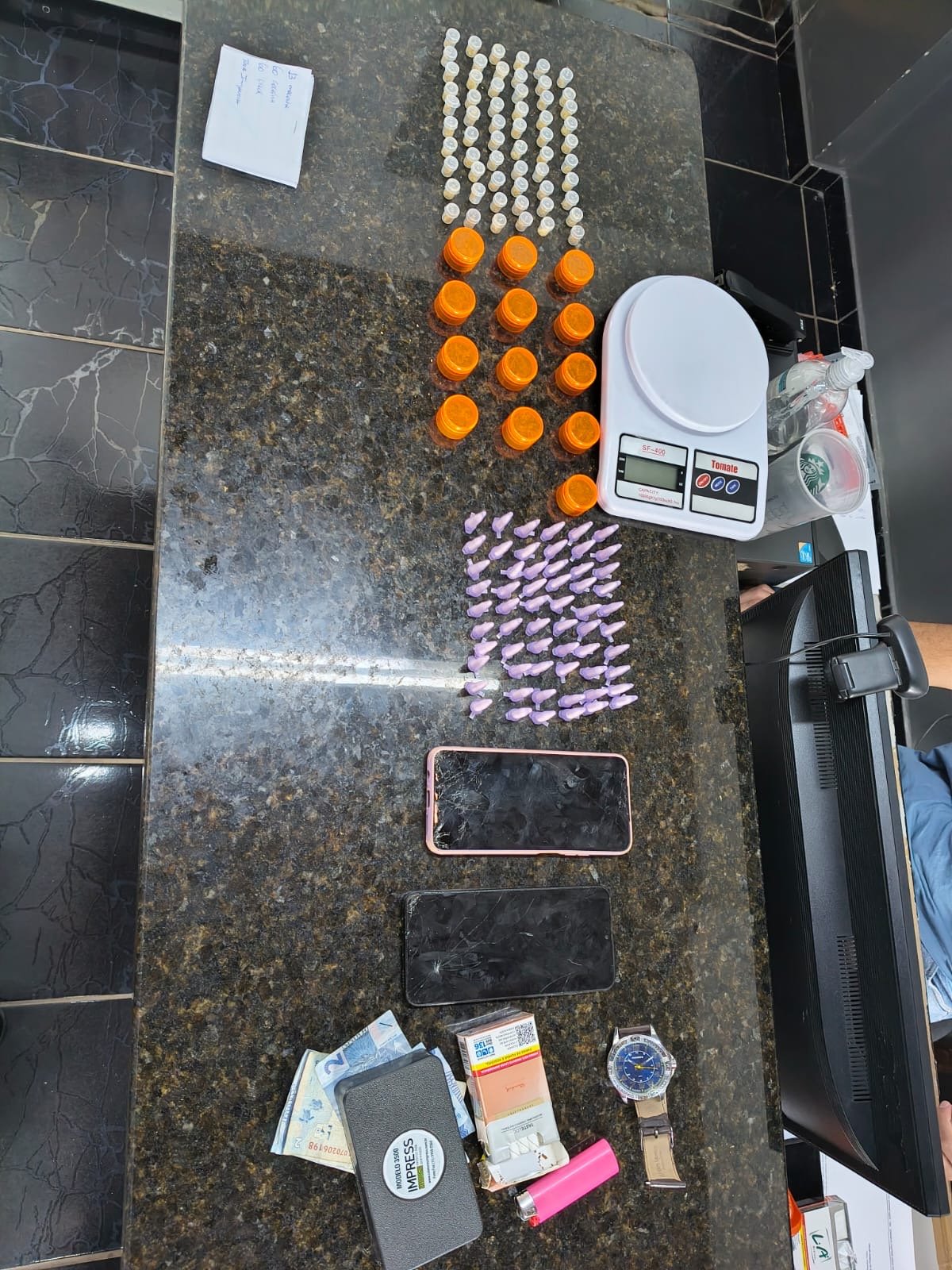 Diante da fundada suspeita, ambos foram abordados. Com o homem, identificado como Mateus, foi localizada a quantia de R$ 10 em notas trocadas no bolso da blusa. Na sequência, os agentes realizaram busca no local onde a sacola havia sido dispensada, obtendo êxito na localização de porções de substâncias análogas à maconha, crack e cocaína.