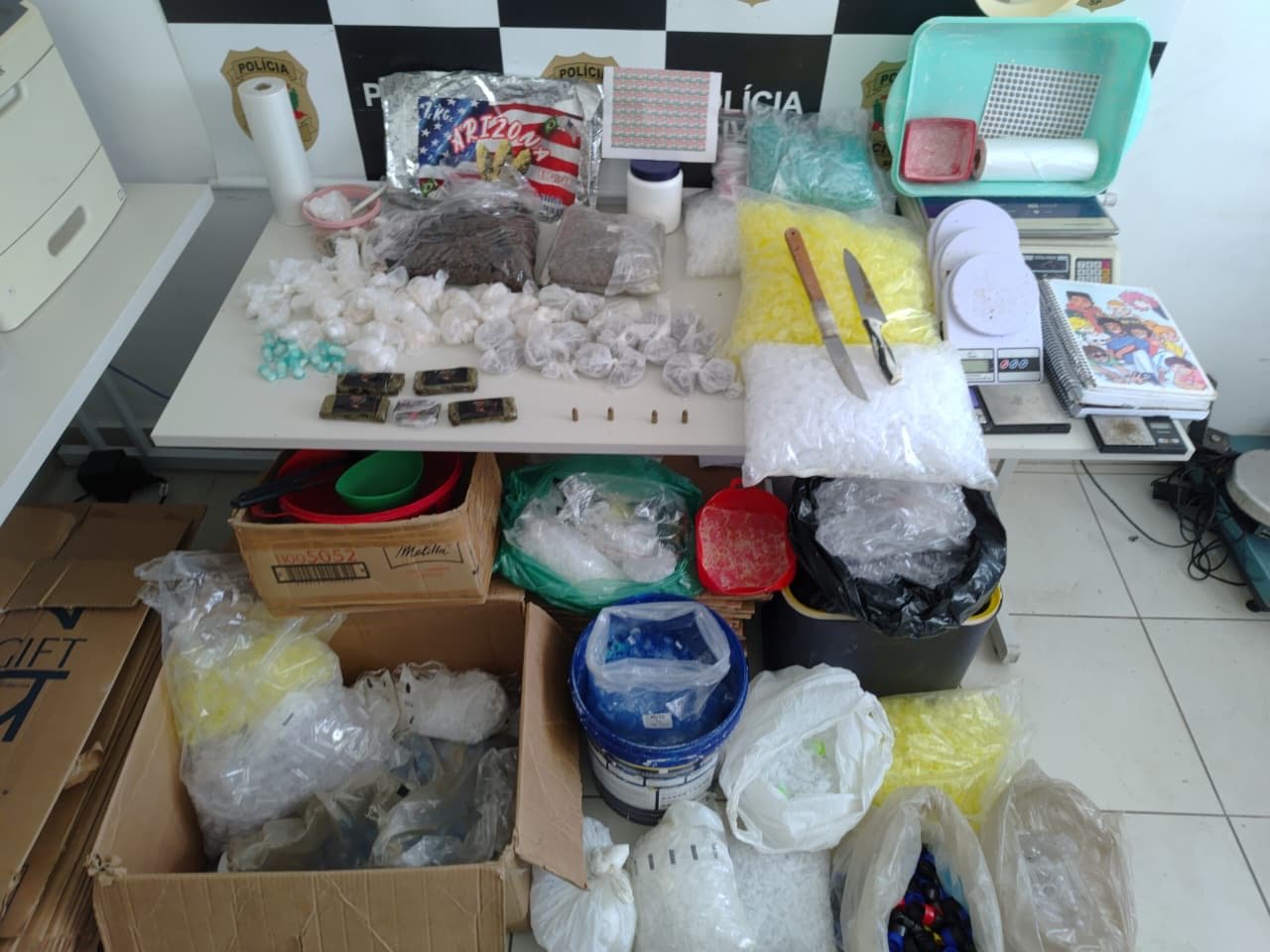No momento da aproximação, os policiais constataram que a porta do apartamento estava aberta, o que possibilitou a entrada no local. Durante a vistoria, foram encontrados aproximadamente 3 quilos de drogas variadas, já prontas para distribuição.