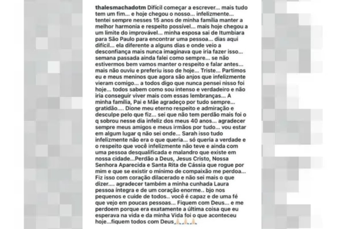 A esposa de Thales e mãe das crianças estava viajando no momento do crime. Horas antes do ocorrido, ele publicou um vídeo nas redes sociais ao lado dos filhos, declarando amor aos dois.