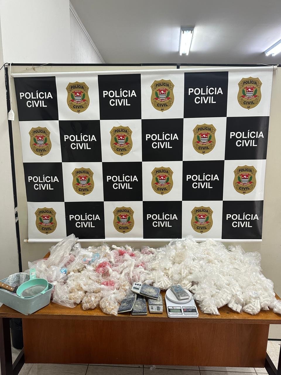 Entre os objetos apreendidos estavam balança de precisão, bacia plástica e peneira com resíduos de pó branco semelhante à cocaína, além de um ventilador de metal utilizado para arejar o ambiente onde a droga era manipulada.