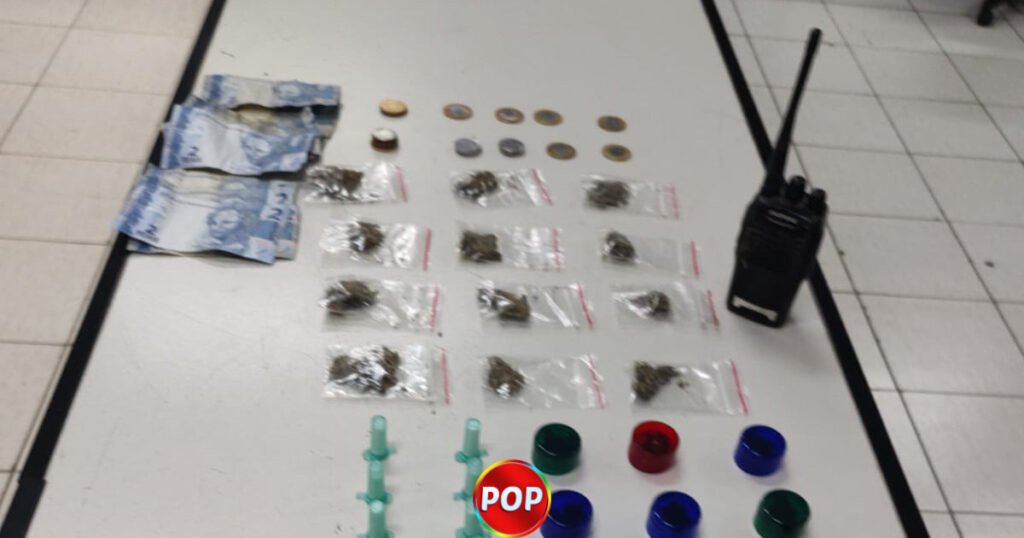 Na sacola havia centenas de porções de drogas (crack, maconha e cocaína), além de um rádio comunicador.