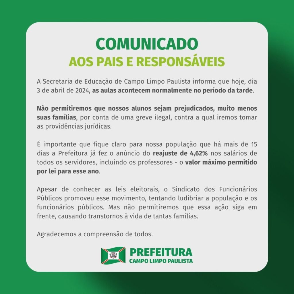 Campo LimpoEducação Após anuncio da greve, prefeitura emite comunicado aos pais dos alunos da rede pública. por O estagiário em 03/04/2024 COMUNICADO: