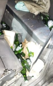 Os GCMs fizeram uma vistoria no veículo, onde foi localizado várias garrafas de bebida alcoólica.