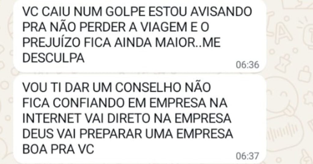 A vítima ainda mandou mensagem para os criminosos; um dos contatos chegou a dar um conselho para a vítima: que ela não acreditasse em tudo o que vê na internet.