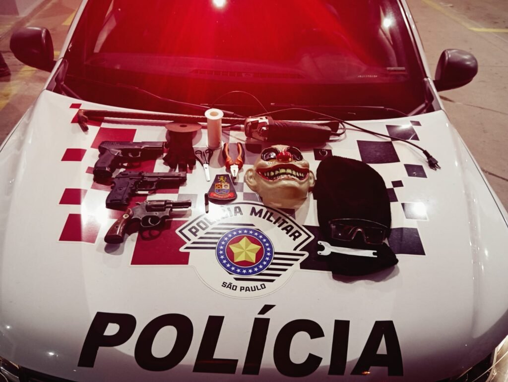 Ato contínuo, outro criminoso foi preso pelos policiais, que localizaram dois simulacros de arma de fogo, máscaras e equipamentos utilizados na ação delituosa.