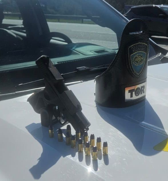 Na busca veicular, foi localizada uma arma de fogo: uma pistola TAURUS G2C TORO, calibre .38 TCP, com 13 munições intactas.