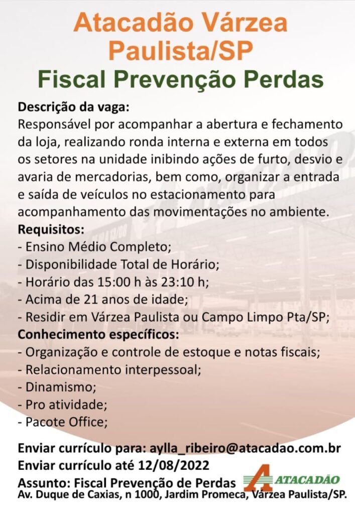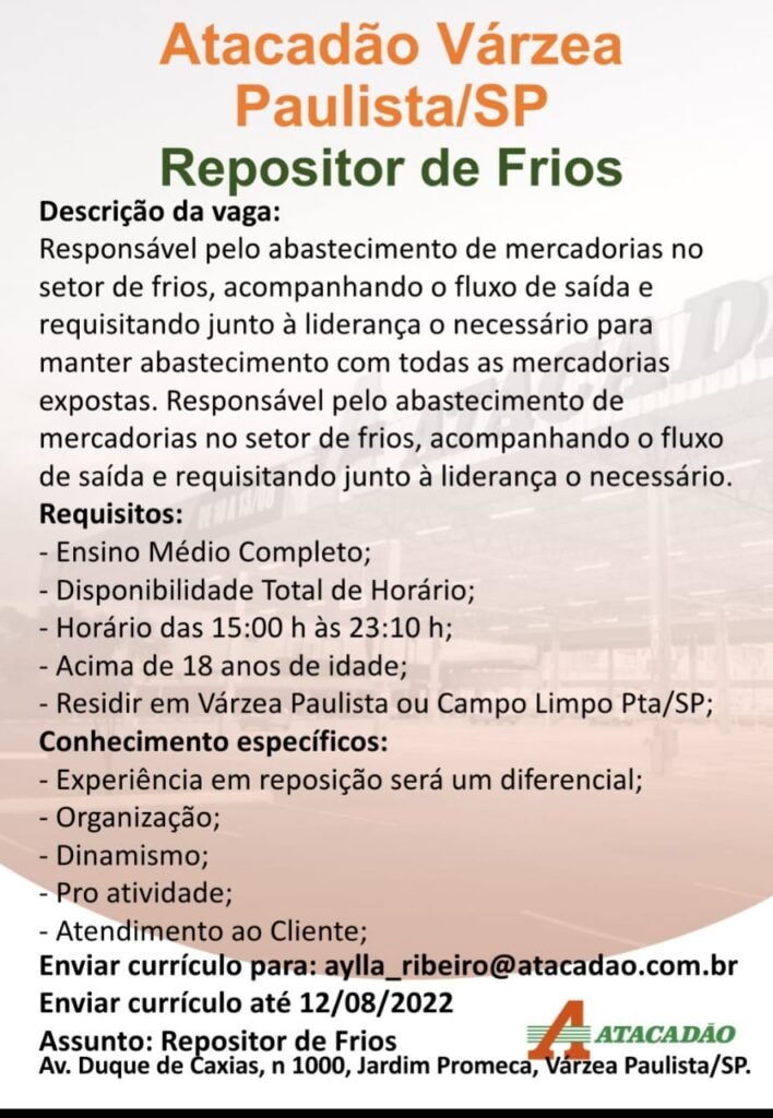 Várzea Paulista Atacadão de Várzea inicia processo de seleção de trabalhadores nesta quarta-feira (10) por Redação em 10/08/2022 Nesta quarta-feira (10) o atacadista “Atacadão” iniciará um processo seletivo para contratação de novos funcionários. Os interessados devem comparecer ao Atacadão, na Avenida Duque de Caxias, nº1000, em Várzea Paulista