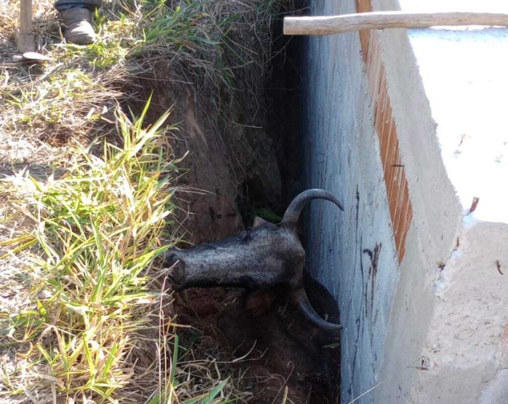 Boi fica preso em vala e mobiliza bombeiros e agentes da defesa civil.