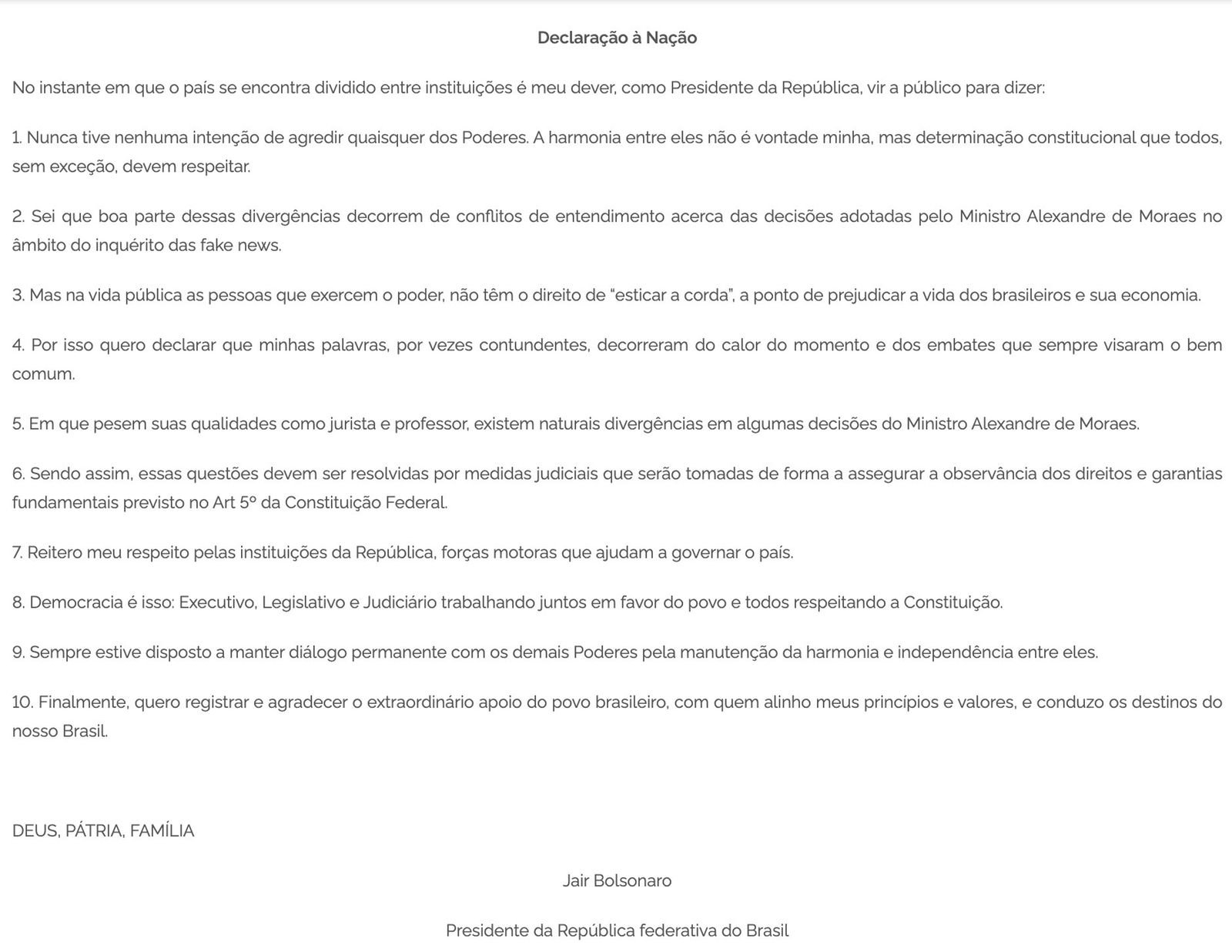 Ministros do STF receberam com cautela a carta de pacificação divulgada por Jair Bolsonaro na tarde desta quinta-feira (9/9). Consideraram positivo o gesto, que, na avaliação deles, ocorreu porque o presidente teve medo das consequências de suas falas.