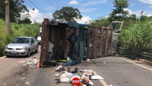 Na manhã desta segunda-feira (06), um caminhão de lixo acabou tombando.