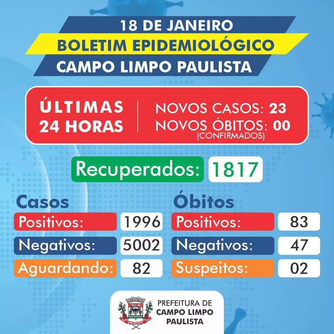 A prefeitura de Campo Limpo Paulista divulgou mais um Boletim Epidemiológico nesta segunda-feira (18). Entraram nas últimas 24 horas, 23 novos casos positivos e nenhuma morte.