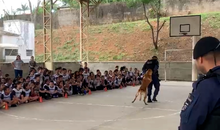 Na última semana, a Escola Municipal de Educação Básica (EMEB) Pedro Clarismundo Fornari, no bairro do Rio Acima, recebeu a equipe de guardas (GM Sérgio Luiz, o Cão Zeus, com a coordenação do subinspetor Cristiano) para a apresentação. Cerca de 100 alunos acompanharam as acrobacias dos guardas.
