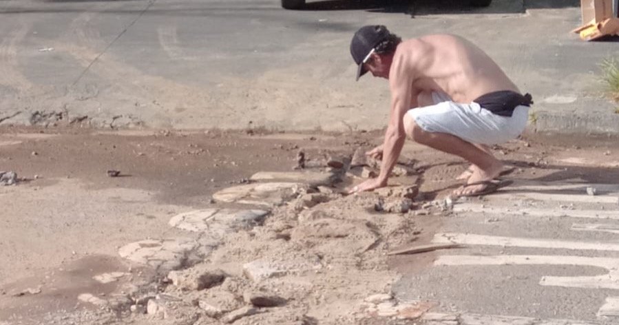 Cansado de pedir para um vereador reeleito, morador realiza serviço de “tapa-buraco” sozinho.