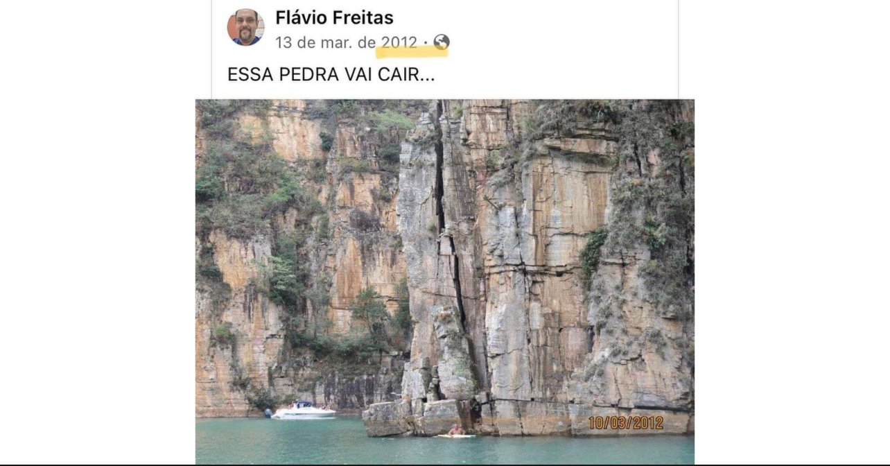 Dono de lancha e apaixonado por navegar em mares e lagos, o médico Flávio Freitas, de Ilhabela (SP), se mantém informado sobre notícias de acidentes náuticos em grupos no WhatsApp. Foi por um deles que ele soube da queda da rocha do paredão de cânion, em Capitólio (MG), neste sábado (8/1), que causou, até o momento, a morte de sete pessoas. Imediatamente, ele lembrou de quando esteve no local, em março de 2012, e viu a fenda. Na ocasião, ele registrou, no perfil do Facebook, o perigo e determinou: “essa pedra vai cair”. Hoje, ele compartilhou a foto e lamentou que a “previsão” estava correta.