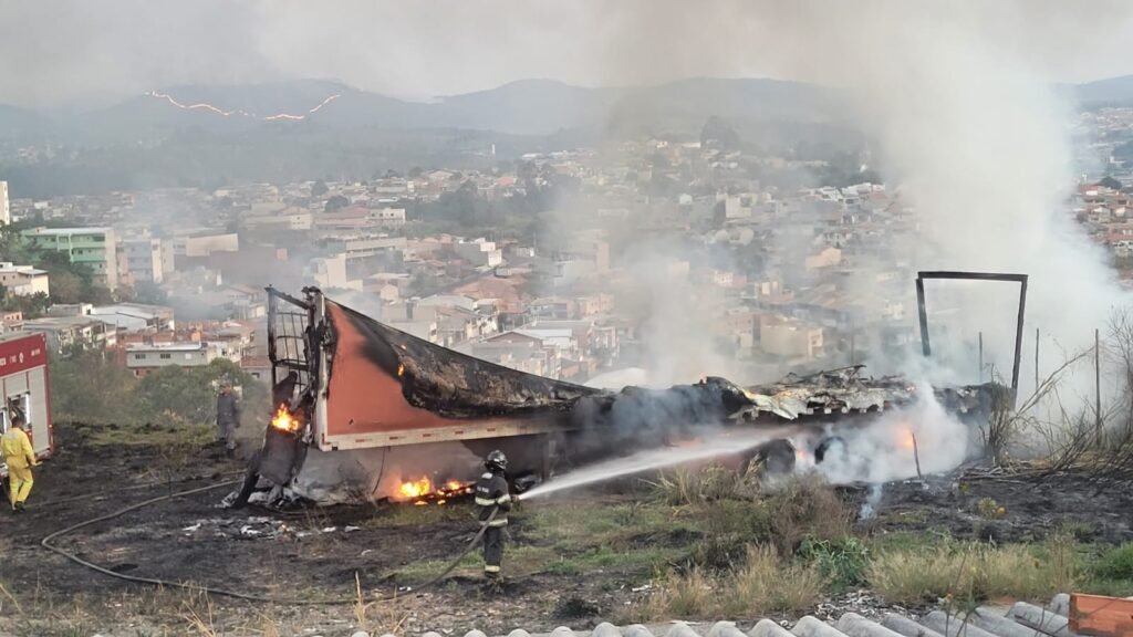 Carreta abandonada pega fogo em um terreno na região da Avenida Walter Gossner, divisa de Várzea Paulista com Jundiaí.