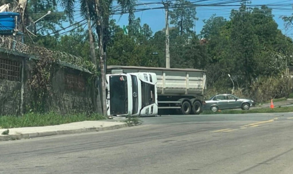 No início da noite desta sexta-feira (08), o veículo ainda segue tombado no local.