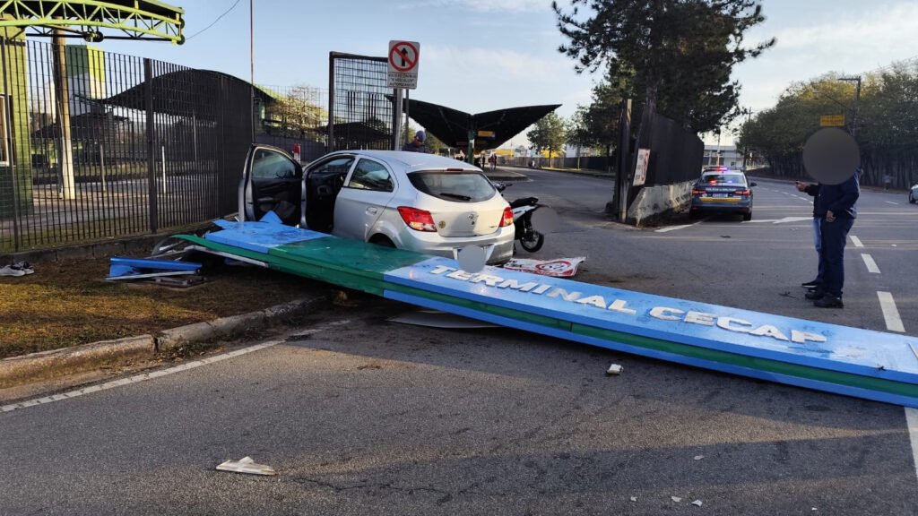 Na manhã desta quinta-feira (07), um veículo bateu contra uma placa de identificação do terminal Cecap, em Jundiaí.