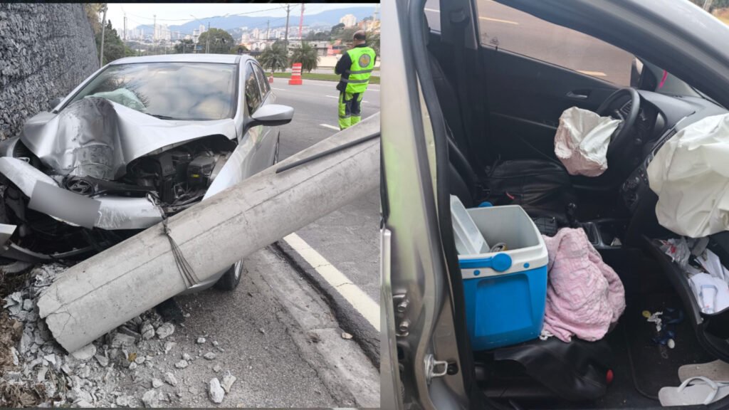 O acidente ocorreu no sentido Louveira. Com o impacto da batida, o poste quebrou no meio.