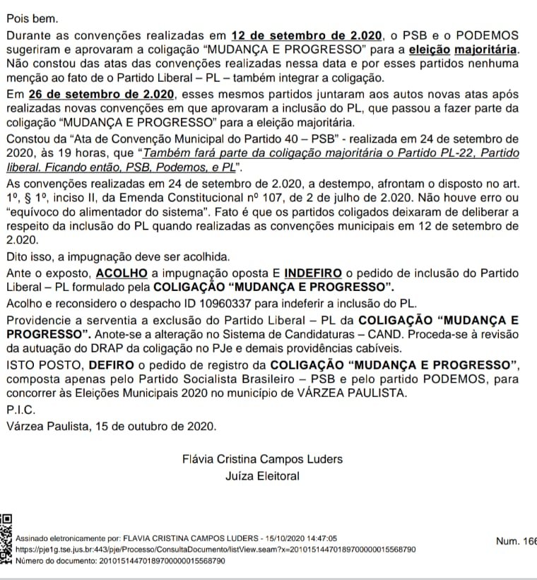 Em decisão concedida no último dia 15 de Outubro, a Juíza Eleitoral de Várzea Paulista, retirou o Partido Liberal da Coligação de Junior Aprillanti por irregularidades ocorridas durante a convenção. Para não realizarem *propaganda irregular* os 13 (treze) candidatos a vereador pelo PL deverão fazer alterações retirando o candidato a Prefeito, PSB e PODEMOS também deverão revisar todo seu material de campanha excluindo PL na menção da coligação, inclusive dos materiais impressos.