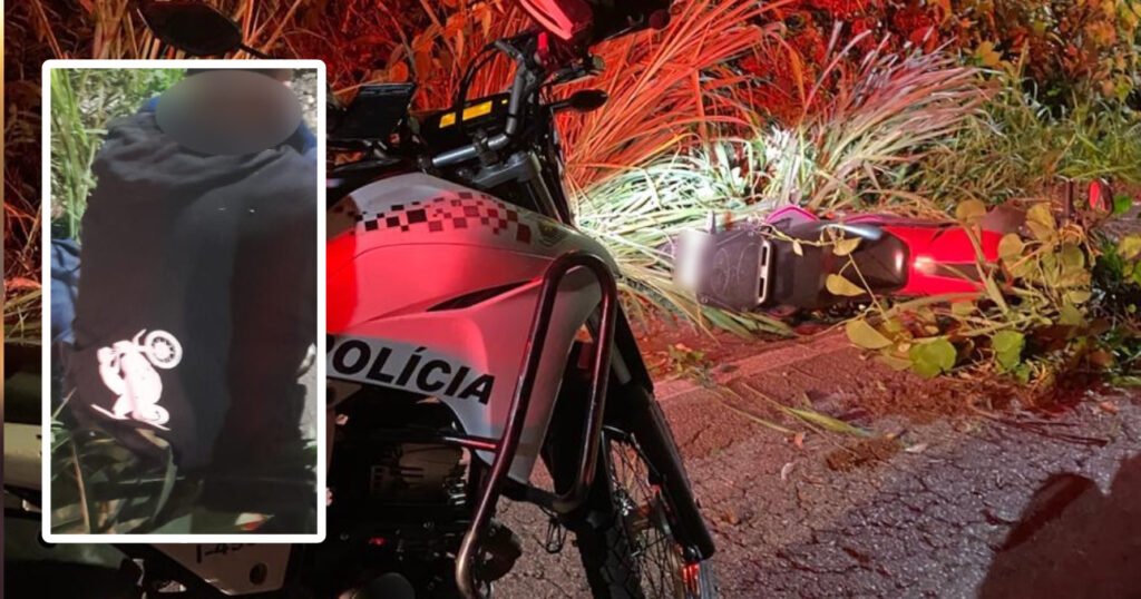 Com a namorada na garupa, o motociclista que estava empinando tentou fugir da RPM, mas acabou se acidentando.