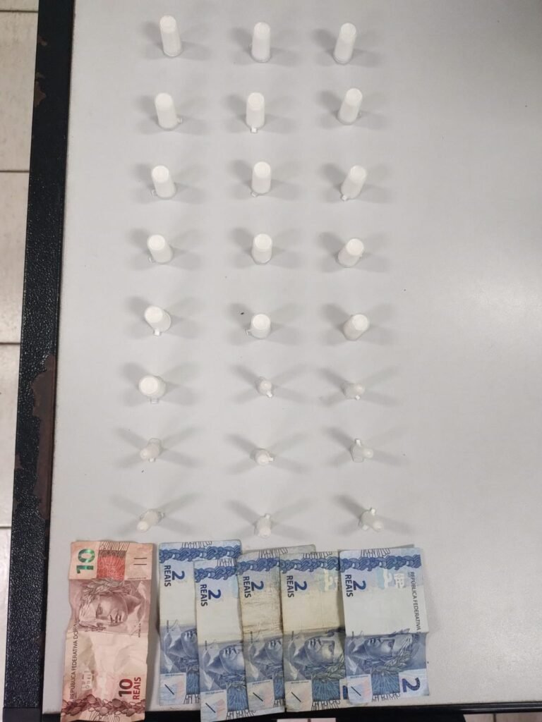 Na sacola, foram localizadas porções de cocaína, prontas para venda, e dinheiro em espécie.