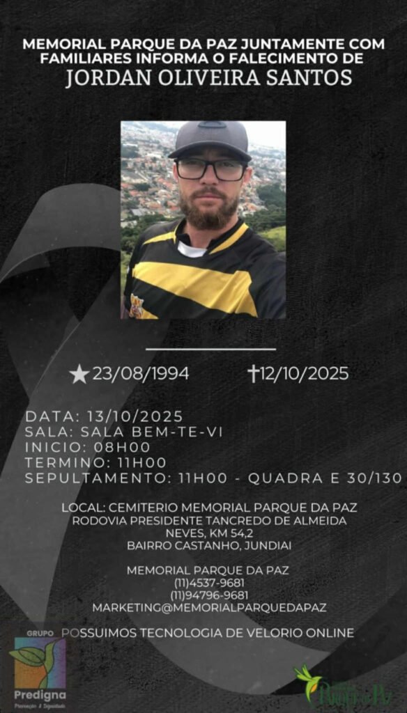 O corpo do jovem Jordan Oliveira Santos, de 30 anos, será velado nesta segunda-feira (13), na Sala Bem-te-vi do Memorial Parque da Paz, em Jundiaí. O velório terá início às 8h e término às 11h, horário em que ocorrerá o sepultamento, na Quadra E, 30/130, do mesmo cemitério.