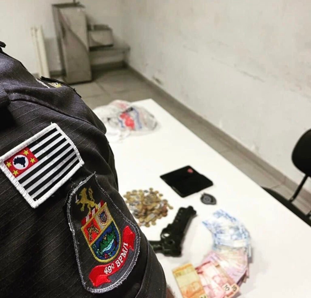 A equipe recebeu informações de que havia um roubo em andamento em uma sorveteira, os policiais localizaram o indivíduo com as características informadas e na busca pessoal foi localizado o dinheiro, celular e um simulacro de arma de fogo.
