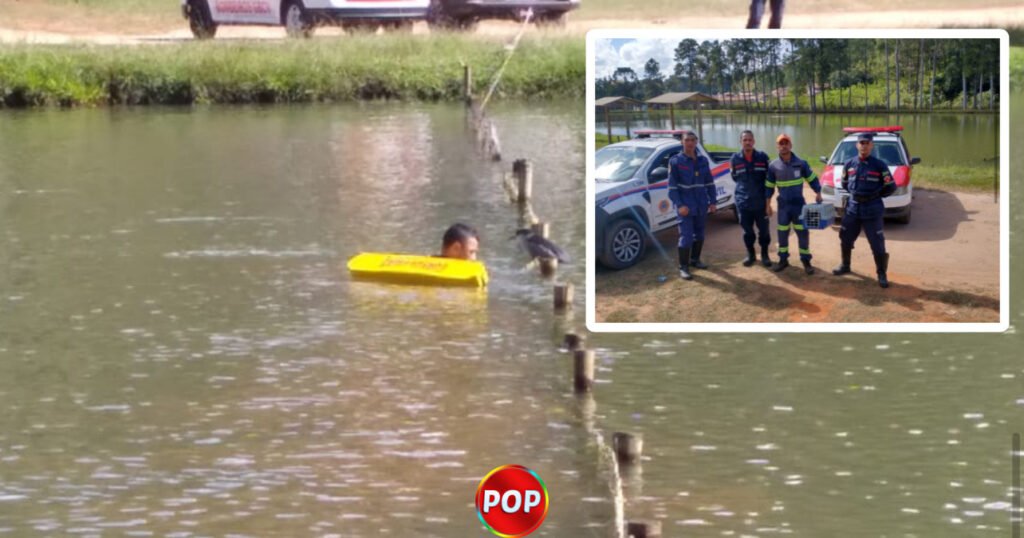 Defesa Civil e Bombeiros GBCV resgatam ave presa em lago.