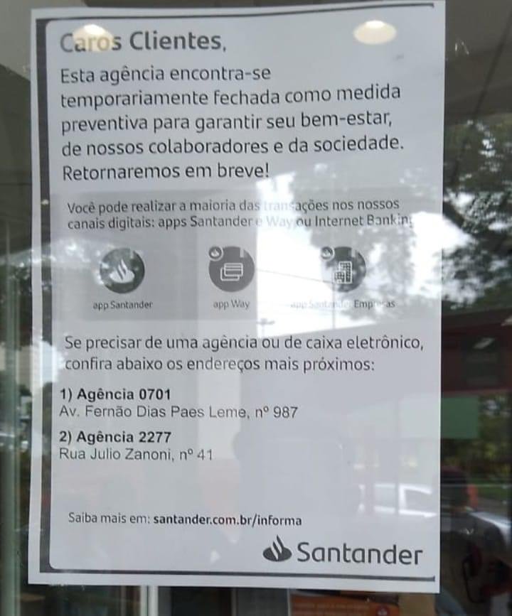 Devido a síndrome gripal, agência do Santander de Campo Limpo fecha por tempo indeterminado