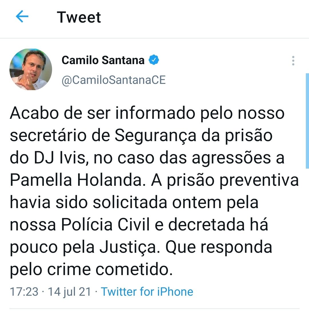 “Acabo de ser informado pelo nosso secretário de Segurança da prisão do DJ Ivis, no caso das agressões a Pamella Holanda. A prisão preventiva havia sido solicitada ontem pela nossa Polícia Civil e decretada há pouco pela Justiça. Que responda pelo crime cometido”, afirma o governador.