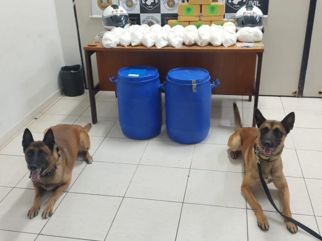 Durante a vistoria em um dos imóveis, os policiais localizaram um tijolo de maconha escondido sob a pia da cozinha. Com o apoio dos cães farejadores Athos e Mike, as equipes intensificaram as buscas e encontraram mais entorpecentes tanto dentro quanto fora da residência.