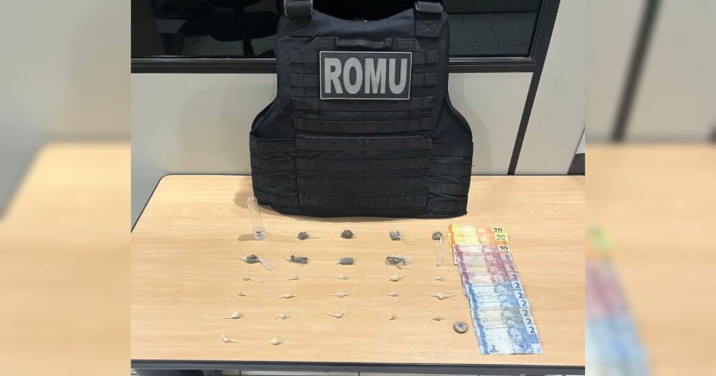Os Guardas realizaram abordagem do mesmo. Em busca pessoal foram localizadas porções de drogas e dinheiro trocado.