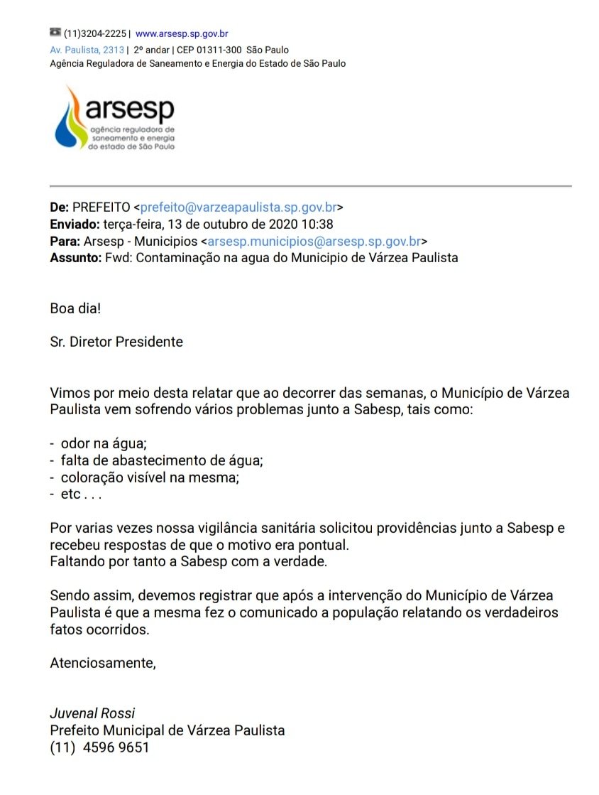 Enquanto candidatos da oposição gritavam alto e usavam uma situação delicada e constrangedora para ganhar mídia. O prefeito Juvenal Rossi, mais uma vez parece ter mostrado a que veio. Após esgotar todas as tratativas com a equipe da SABESP , Juvenal teria acionado a vigilância sanitária e denunciado a Sabesp para ARSESP (Agência Reguladora de Saneamento e Energia do Estado de São Paulo), isso é o que prova documento obtido com exclusividade pela POP.