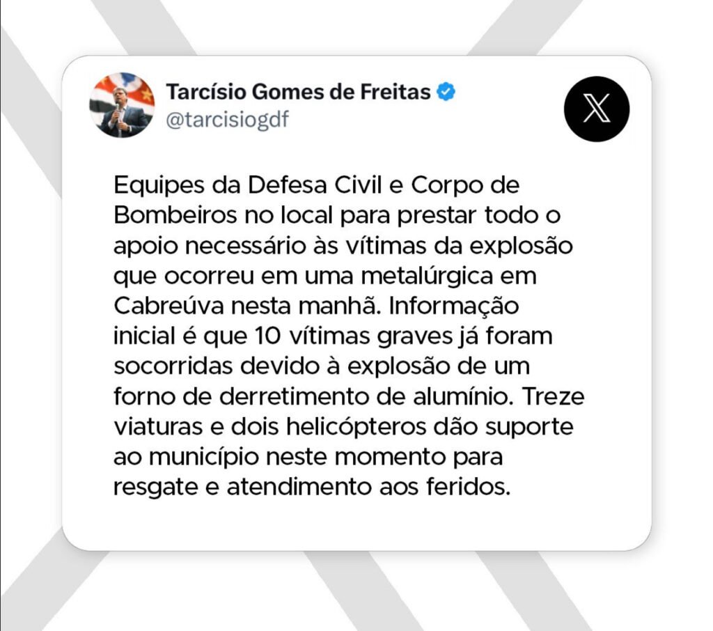 O governador de São Paulo Tarcísio de Freitas (Republicanos) publicou nas redes sociais que equipes da Defesa Civil e Bombeiros do estado foram até o local para atender os feridos.
