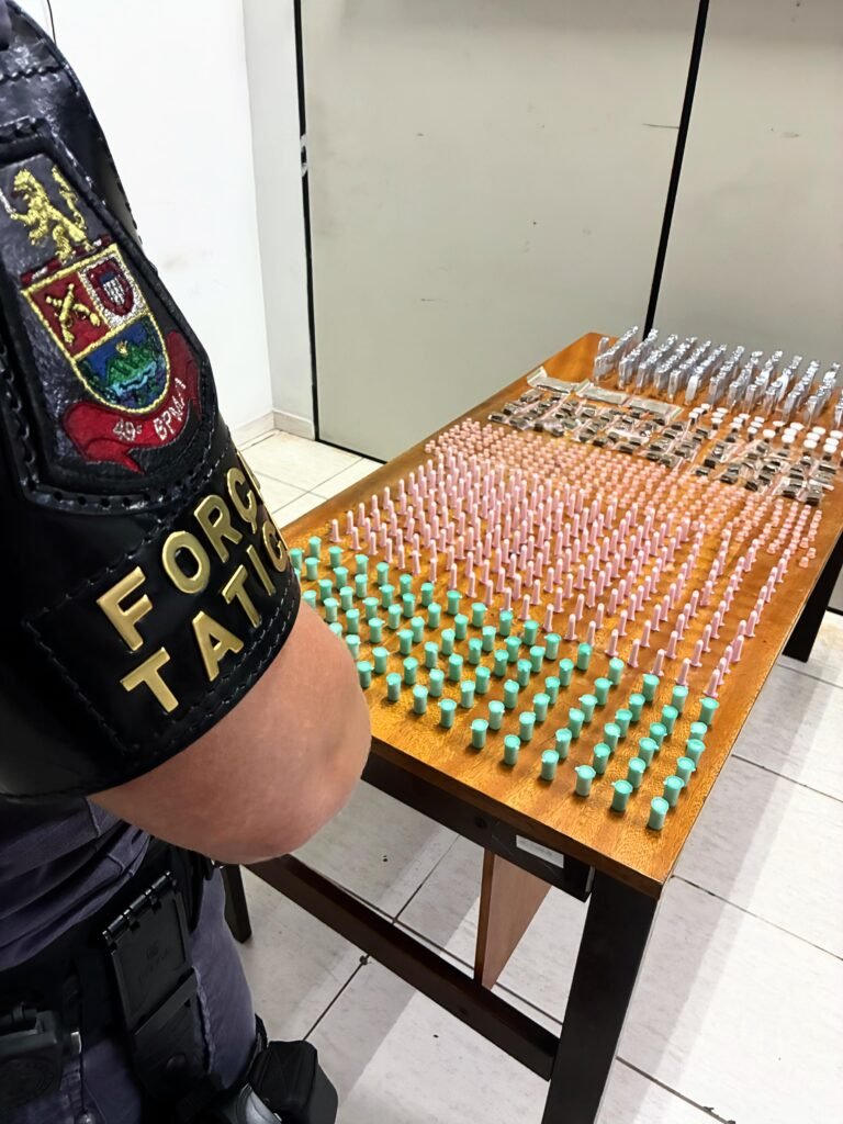 Durante a ação, ao passarem pelo bairro Vila Real — em um local já conhecido pelo tráfico de drogas — os policiais avistaram um indivíduo sentado em uma viela. Ao perceber a aproximação da equipe, o homem tentou se desfazer de uma sacola e caminhar em direção aos policiais.