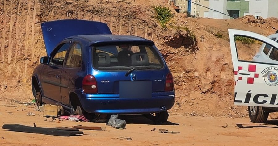 Populares localizaram um veículo Corsa, abandonado e sem as quatro rodas.