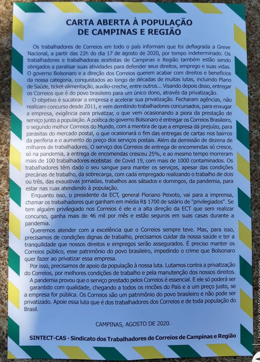 Várzea Paulista Funcionários dos Correios fazem manifestação no centro de Jundiaí por O estagiário atualizado 16/09/2020 Na manhã desta quarta-feira (16), os funcionários dos Correios realizam uma manifestação no centro da cidade Jundiaí. A categoria luta contra o fim dos seus direitos e também contra a privatização. Eles estão divulgando uma carta aberta a população Correios