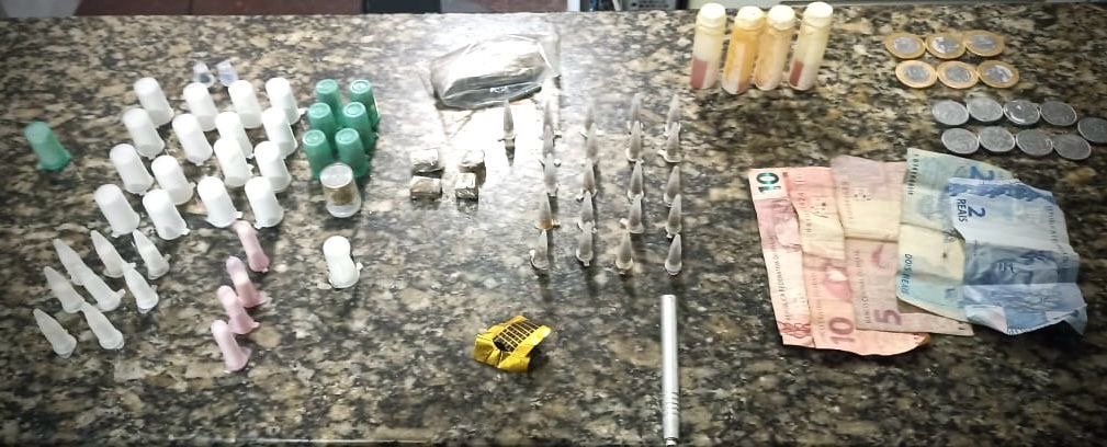 A equipe realizou a abordagem e localizaram um pacote contendo 30 (trinta) tubetes de cocaína, 33 (trinta e três) invólucros de maconha, 02 (dois) tubetes com LSD, 04 (quatro) vidros com lança perfume e R$ 39,00 (trinta e nove reais) em dinheiro.