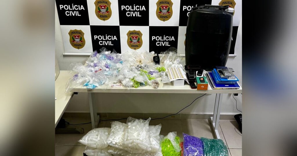 Além disso, foi localizado um galão de 25 litros de lança perfume, 9 mil tubetes vazios. 6 balanças de precisão, 13 celulares, 1HT e 6 cadernos de anotações com a contabilidade do tráfico.