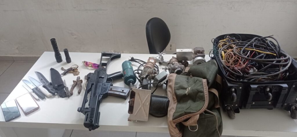 Durante a revista pessoal, os guardas encontraram na mala e da bolsa, diversos fios cortados, ferramentas, uma serra circular, dois aparelhos celulares e uma arma de airsoft.