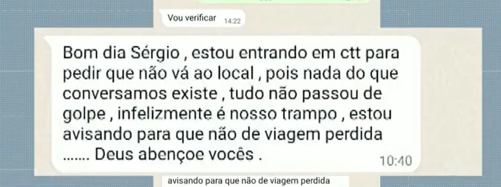 “Bom dia Sérgio, estou entrando em ctt para pedir que não vá ao local, pois nada do que conversamos existe, tudo não passou de golpe, infelizmente é nosso trampo, estou avisando para que não de viagem perdida… Deus abençoe vocês”.