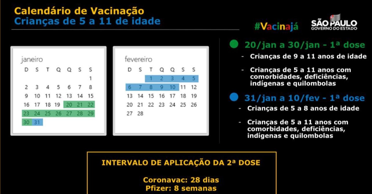 De 20 a 30 de janeiro – crianças de 9 a 11 anos de idade e crianças de 5 a 11 anos de idade com comorbidades, deficiências, indígenas e quilombolas.
