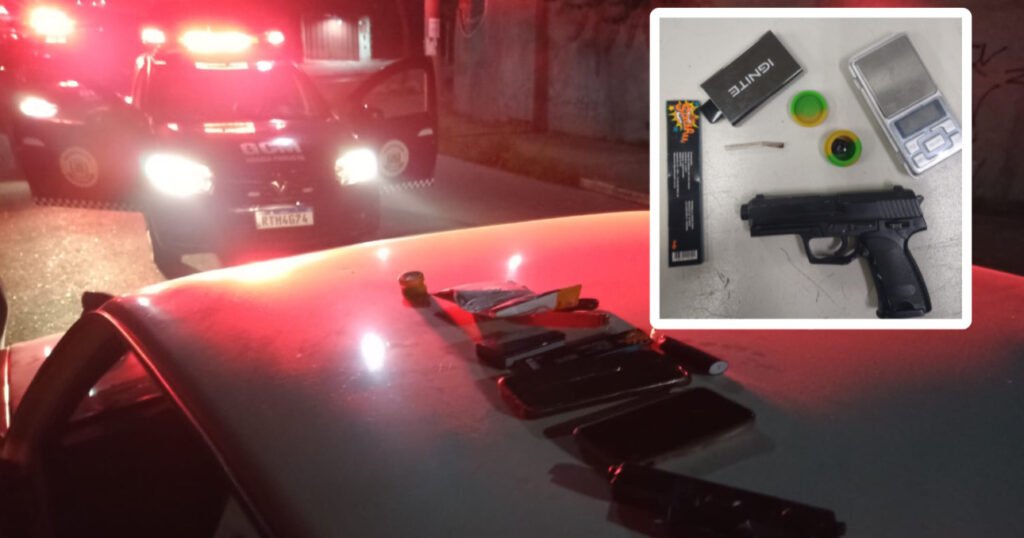 A equipe realizou a abordagem, no veículo havia duas pessoas: um jovem e uma menor de idade. Em revista pessoal, foram localizadas uma réplica de pistola e uma pequena quantidade de drogas.