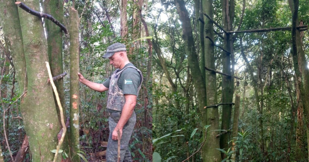 Nesta terça-feira (05), os Guardas Ambientais: Nespoli,Nogueira e Santos Gomes durante patrulhamento a pé em área de mata pela Serra do Mursa localizaram uma estrutura feita por caçadores criminosos chamada de “JIRAU” para caçar animais silvestres, as estruturas foram destruídas, os caçadores já haviam se evadido do local.