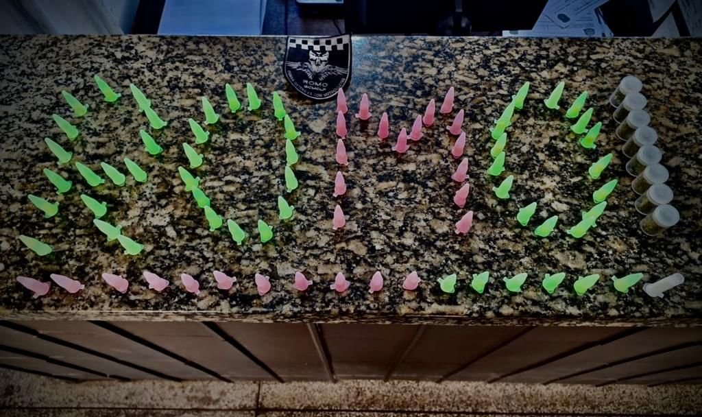 O embrulho continha 47 (quarenta e sete) eppendorfs de crack, 34 (trinta e quatro) eppendorfs de cocaína, e 08 (oito) invólucros de maconha.