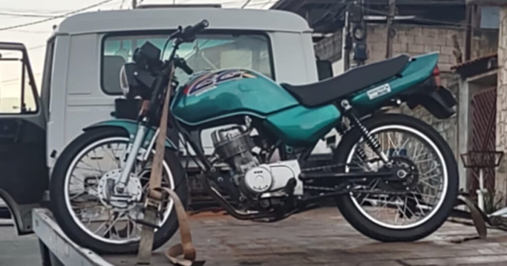 Durante averiguação, não foi apresentada a documentação da moto, sendo constatado que a moto estava sem equipamentos obrigatórios.